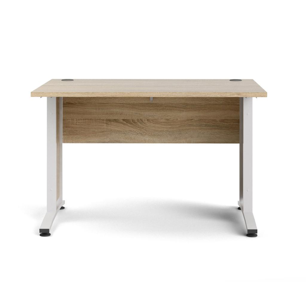 Escritorio de color roble y blanco. Su combinación de colores aportará más calidez a la estancia. Las patas son metálicas. En la parte superior incluye dos soportes para pasar los cables y este siempre ordenado.