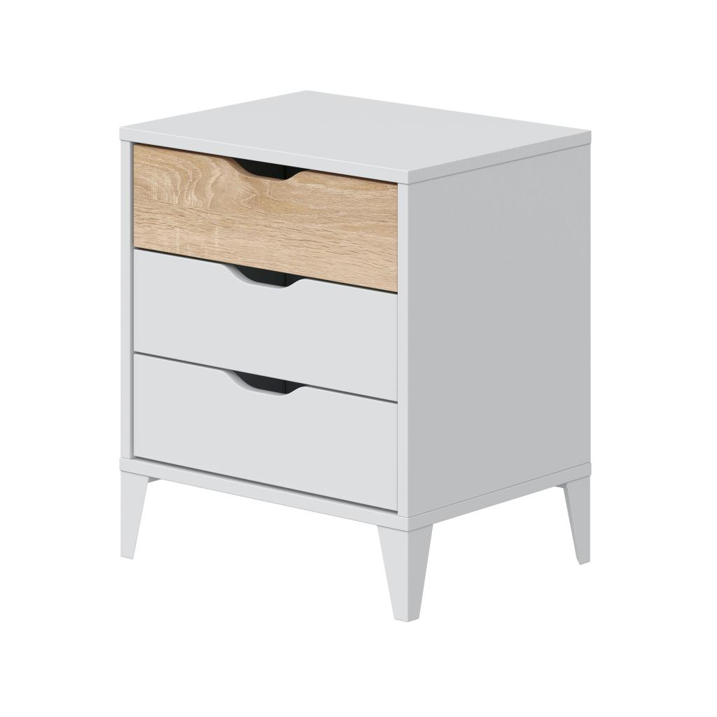 Rebajas Oferta Novedad Mesita Ref: 015400000531 54,99 € Mesita con tres cajones y con patas.Composición: Tablero de partículas, tablero de fibras, lámina de papel, borde de plástico. Disponibilidad: Color Blanco Artik / Roble Canadian Tamaño 44x50x33 cm Ancho x Alto x Fondo Cantidad
