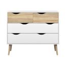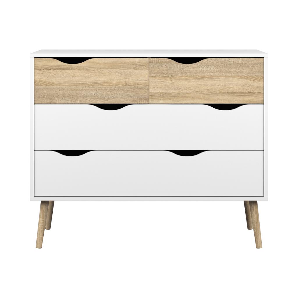 Cómoda de 4 cajones en color blanco y roble delta. Su diseño funcional la hace apta para cualquier habitación del hogar