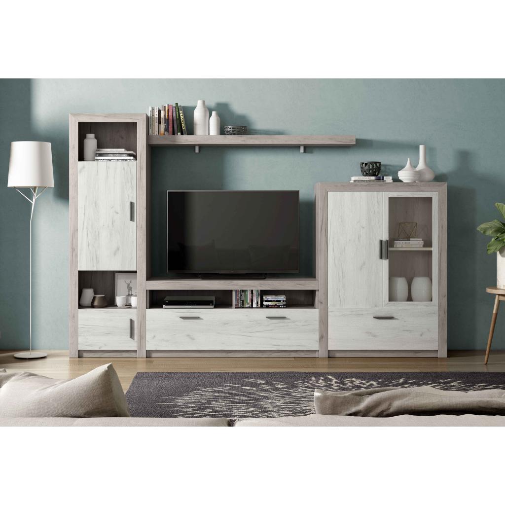 Moderna composición combinada en nordik. Incluye módulo vitrina, mesa tv, bodeguero y estante. Cuenta con gran capacidad de almacenaje