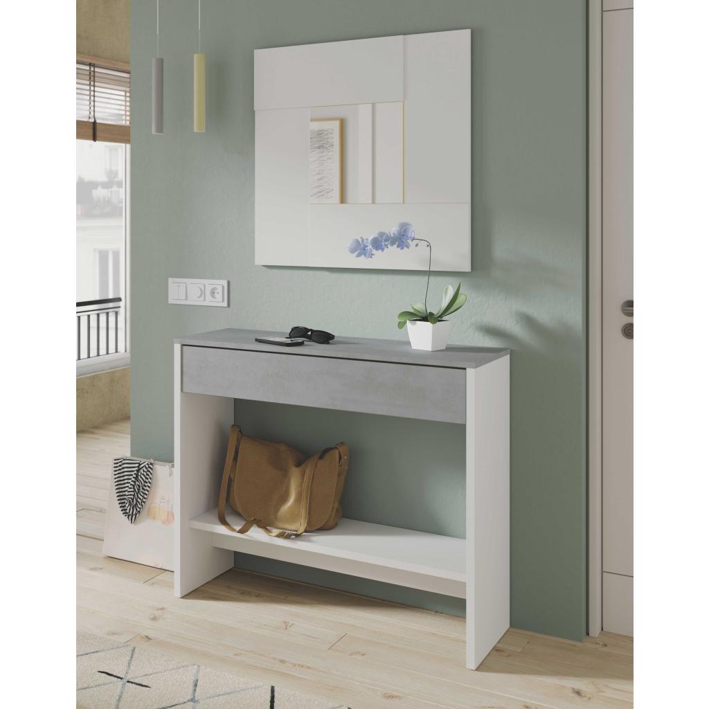 Su tamaño es ideal para todo tipo de entradas, incluso cuando no hay mucho sitio. Incluye espejo, un cajón y un estante para que puedas dejar la cartera o las llaves y las tengas siempre a mano al salir de casa.
