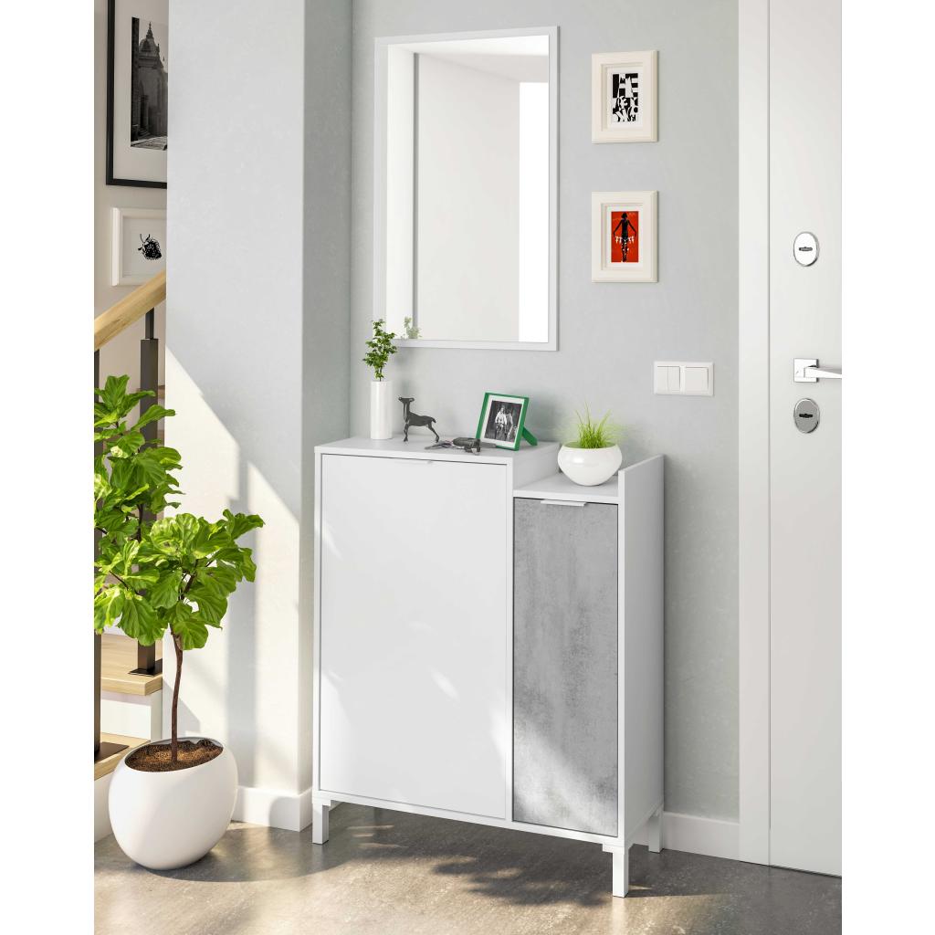 Rebajas Oferta Novedad Recibidor Ethana Ref: 015400000534 79,99 € Recibidor 2 puertas con estantes para almacenamiento, con patas y espejo. Composición: Tablero de partículas, tablero de fibras, lámina de papel, borde de plástico, vidrio templado. Disponibilidad: Color Blanco Artik/Cemento Tamaño Mueble 77x91x24 cm Espejo 50x77x1,8 cm Ancho x Alto x Fondo Cantidad