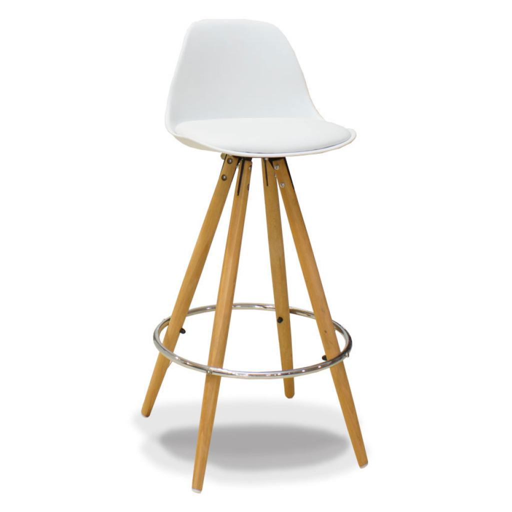 Este modelo de taburete incluye cojín tapizado en polipiel. Patas robustas de madera de haya. Las patas de madera de haya se unen en la parte superior. El cojín está fijado al asiento y no se puede retirar. Se trata de un taburete funcional y cómodo.