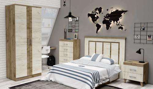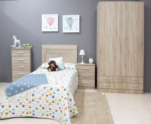 Ver detalles Dormitorio juvenil (Cabecero 90cm) 199,99 € Color Roble Tamaño Cabecero 90x113x3 Armaio 79,4x170,4x49,5 Cómoda 59,4x70,5x29,5 Mesita 40,4x54.5x29,5 cm Ancho x Alto x Fondo Cantidad Ver detalles