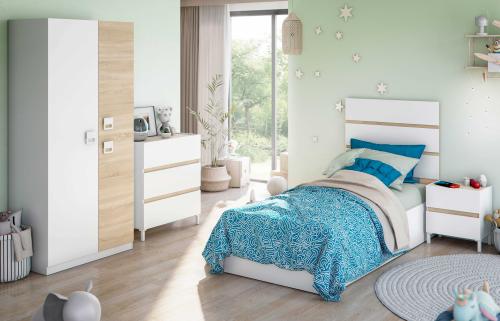 Oferta Ver detalles Dormitoio juvenil (Cabecero 90cm) 399,99 € Color Blanco Artik/Roble Canadiam Tamaño Cabecero 100x126x3 Mesita 50x53x35 Cómoda 79x91x41 Armario 90x200x52 cm Ancho x Alto x Fondo Cantidad Ver detalles